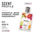 Bloom bursts to life with a vibrant medley of passionfruit, grapefruit, pineapple, tangerine, and ripe strawberry, evoking the refreshing essence of a sunlit orchard.